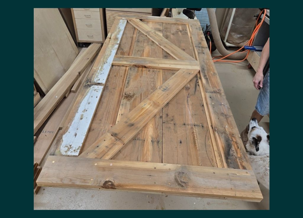 Last week, a good friend asked if I could help her build a barn door-style door. I’ve built a few and knew it wouldn’t be too hard a job, so I agreed. She brought over 25 board feet of used Douglas Fir that came from an old house she had torn down. It was in pretty rough shape with some warps, splits, and old paint, but she was looking for the rustic feel, and with that wood, we already had a good start.