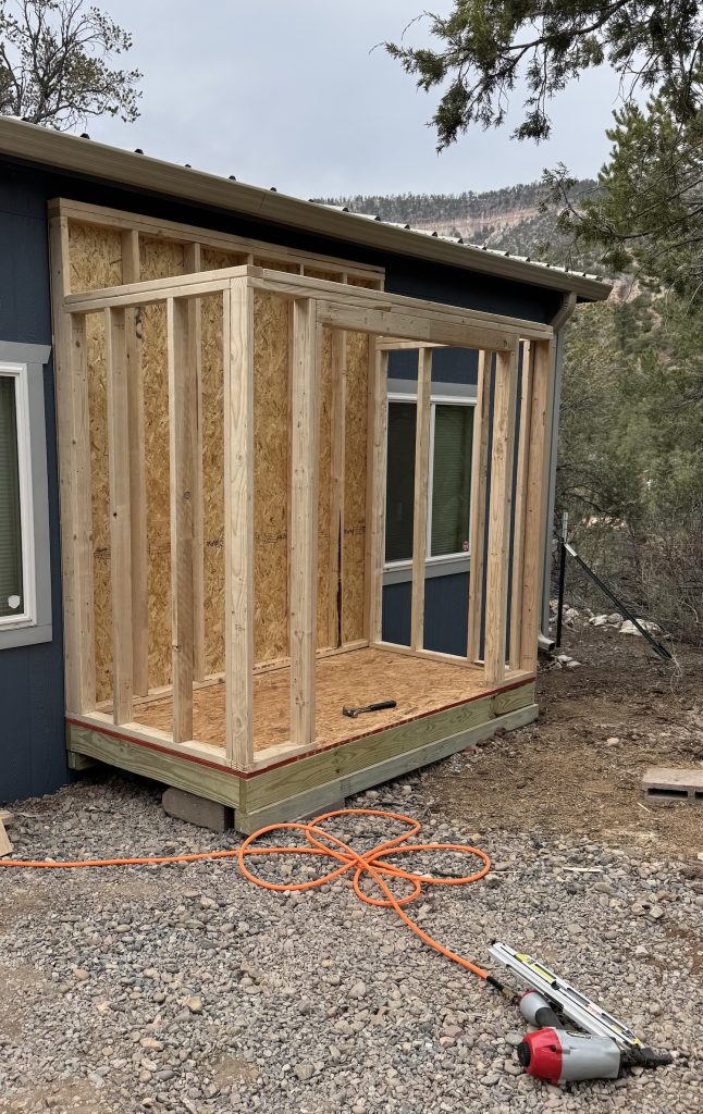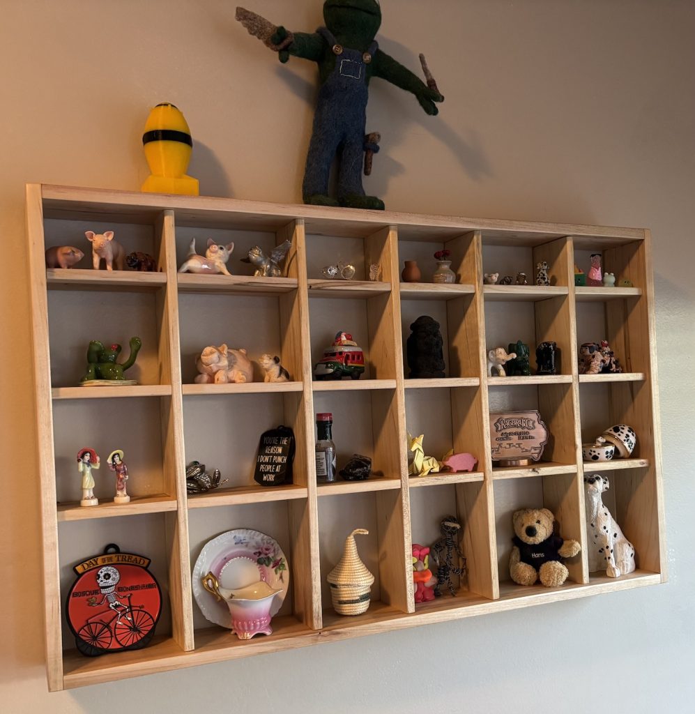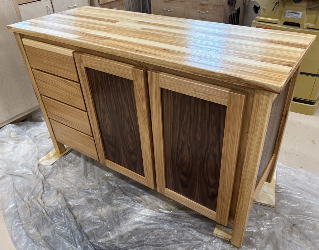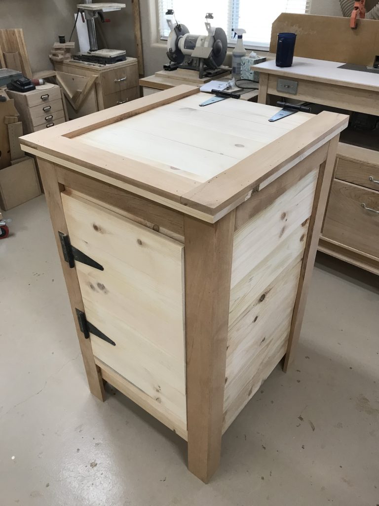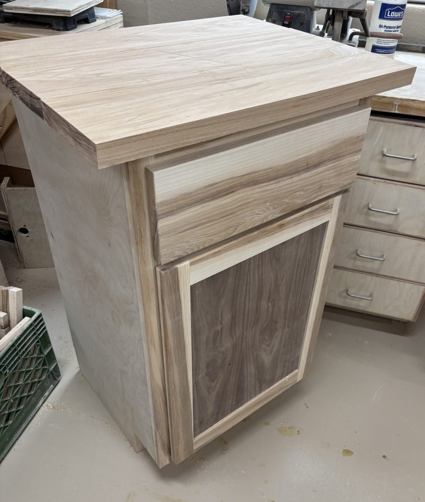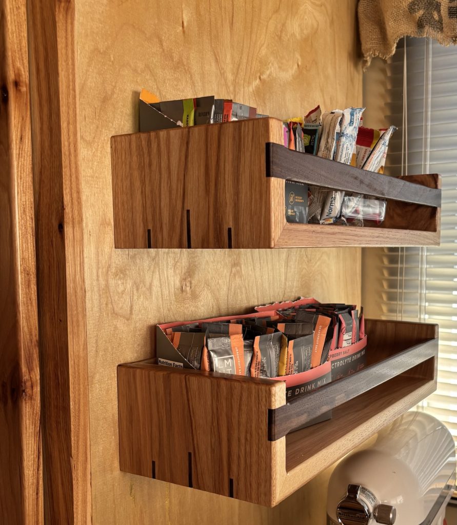 In May, I retired with 37 years of service in the Air Force. It was an amazing career with 20 years of active duty service and 17 years as an Air Force civilian. Over the past ten years, we’ve been working on a cabin in the woods to retire to. One of the challenges was making our 2200 sq ft house full of stuff fit in our 1000 sq ft cabin. These past few months, prior to the move, I’ve been trying to solve that problem with many different storage options — from a tiny shadow box to a storage space big enough for my bikes. Attached are some of my recent projects to help us fit into our new space. I started by building some new cabinets for the kitchen with handy pull-out shelves. Also, for the kitchen, I built a cabinet for our trash can; having a dog means closing up the trash. In our living space, we had a corner that was basically wasted — now it’s storage for blankets and other little-used items. Right above the corner cabinet is a small set of shelves for our DVD collection (yep, we might be a little old school). I built a small cabinet for random items that we need to access easily for our front room. All the pieces in the cabin are made with hickory and walnut to match all the other items I’ve made over the years. I also built a package box for any deliveries we receive. It mostly keeps our packages from getting wet, but it might also deter the average thief. And while the photo attached is of the bike shop under construction, it is actually complete and packed with bikes!
