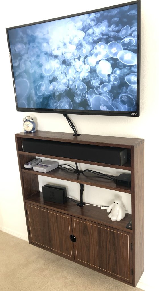 I just recently built this custom piece for one of my regular customers. We’ve worked together on several projects, and this was just another of the great projects I was allowed to help with. It is an electronics cabinet built to fit under the TV in a very small room. It was critical that it fit exactly and not take up any more space than necessary. This walnut 34″ by 34″ cabinet is only 6″ deep. It’s mounted on a French cleat to allow it to hang on the wall to avoid the baseboard and to ensure it would be stable, given its narrow shape. All the electronics are tucked neatly behind two doors with a hole cut for handles (this increases the airflow for cooling the electronics). It has a 1/16″ string inlay around the door to give it just a subtle bit of color.