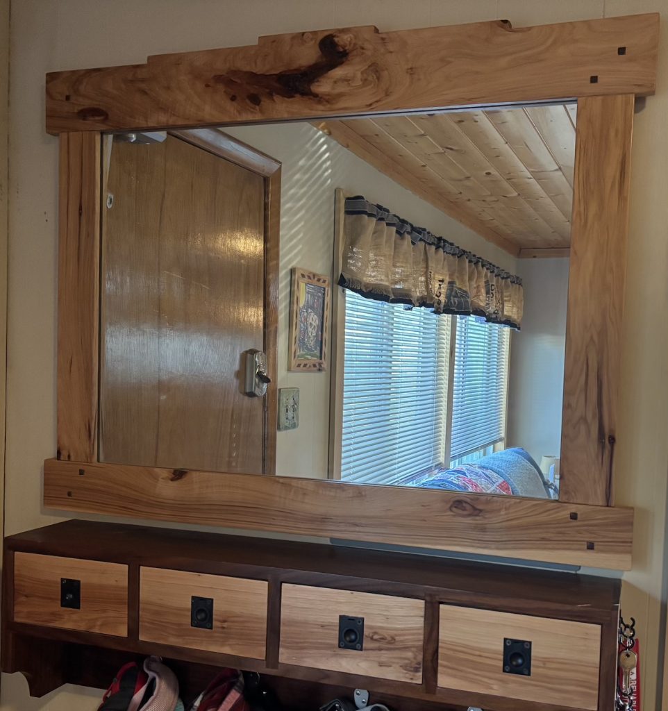 I’ve always loved Greene and Greene style furniture, but it hasn’t fit in the decor of the cabin too well. I finally found a way to make it work with this mirror in our front room. It is a small space, so this large mirror over the hickory and walnut coat rack works perfectly in the space.