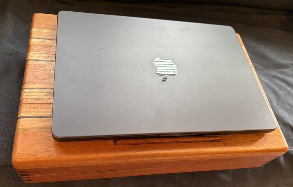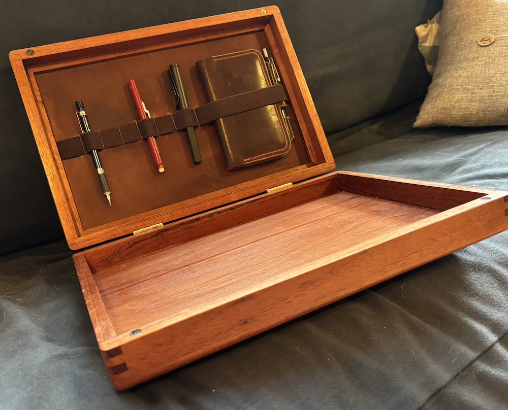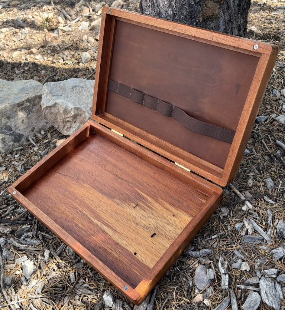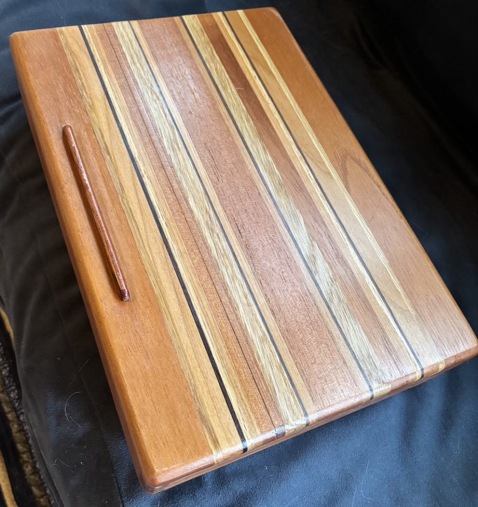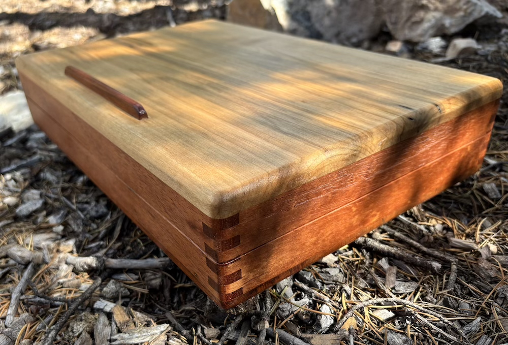 I created another gift project! About three months ago, I retired from federal service, and I’ve been loving every minute in the shop. I’ve mostly been working on projects for the house– space-saving and organizational options (I’ll post some of those later on). Most recently, I built myself a laptop desk, and I decided to build two to include as part of my gift collection. I used Spanish cedar and wormy maple on one, and I use some random jointed pieces for the top of the other. I included a leather insert with elastic to hold pens, pencils, notepads, etc. It is hinged with brass hardware and closes with magnets. It required a great deal of detailed work and several coats of polyurethane. I used ¼” finger joints to join the sides. It only took a couple of days to prepare the lumber and put the cases together, but the leather work and the varnish turned it into a week-long project. I’m quite pleased with the results. I hope to participate in our local Artisan shop as a guest artist in Jemez Springs later this fall. I’ll provide dates when I get them, and if you’re in the area, please stop by, and maybe you’ll see this item on display.