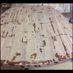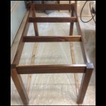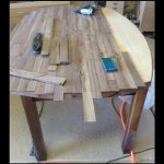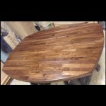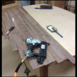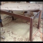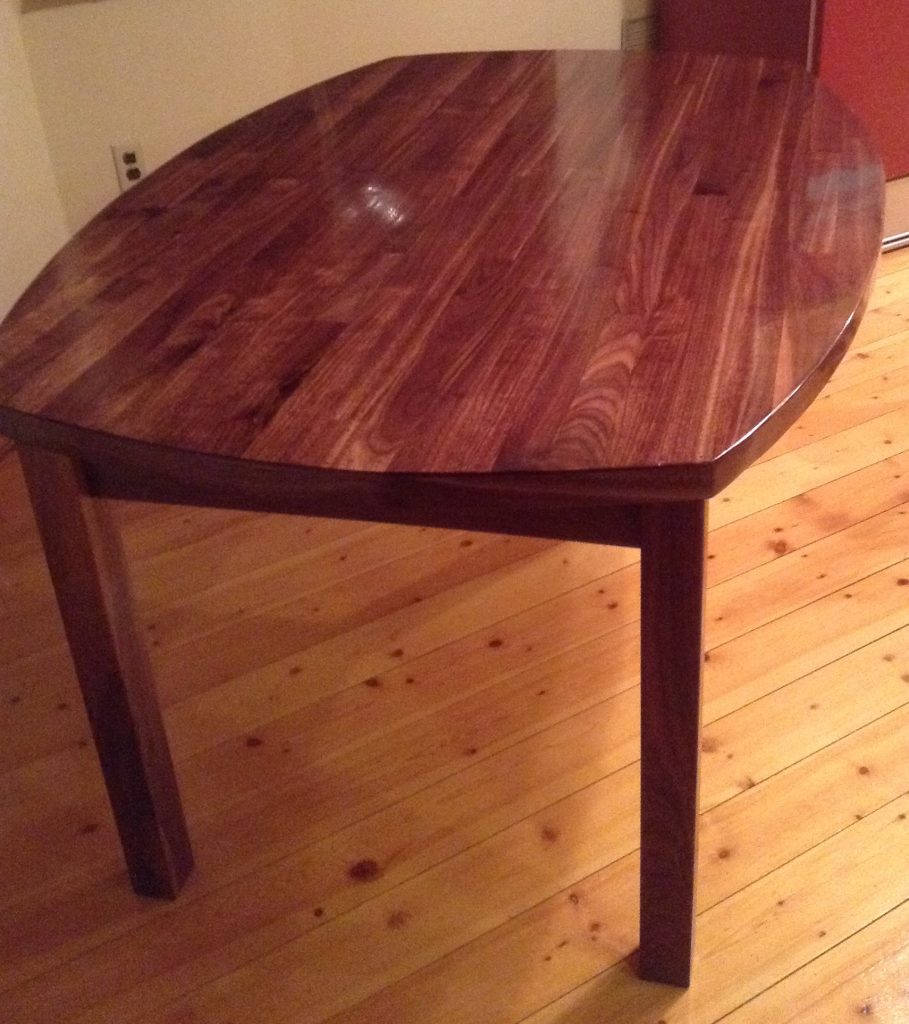 I built this walnut table for the cabin after I saw Jimmy Diresta build a conference table with strips of wood glued to a sub-straight. Watch his video on Youtube to see how Jimmy made his large meeting table https://www.youtube.com/watch?v=ue6zQsR9GkA. I used two sheets of birch plywood as the sub-straight and solid walnut for the 2″ think legs and apron. Then I cut lots of 3/16″ strips to cover the top and sides. I used a curve shape so I cut the side pieces about 1/8″ thick so I could bend them around the curves. When all the strips were in place I used a trim router to cut even with the sub-straight. I used epoxy with sawdust to fill in any holes or gaps and finished it off with eight coats of wiping varnish. It turned out great.